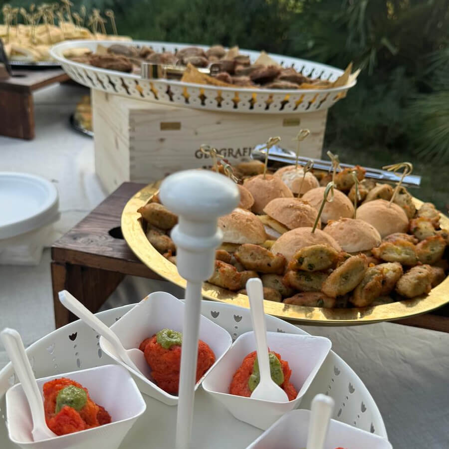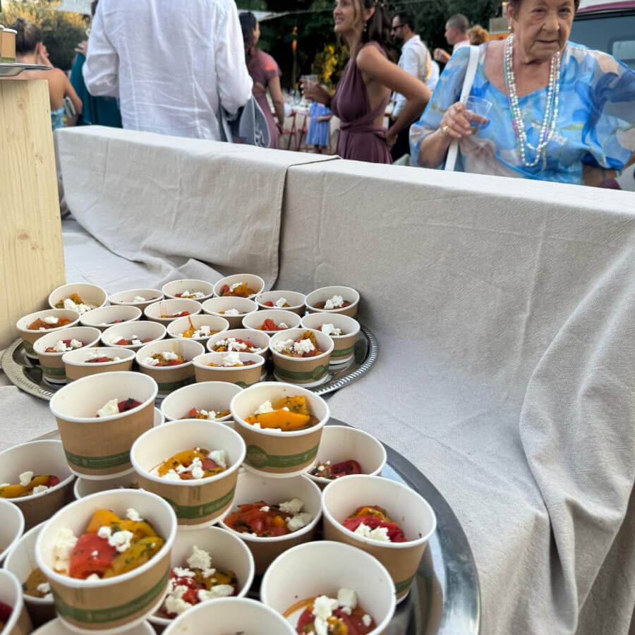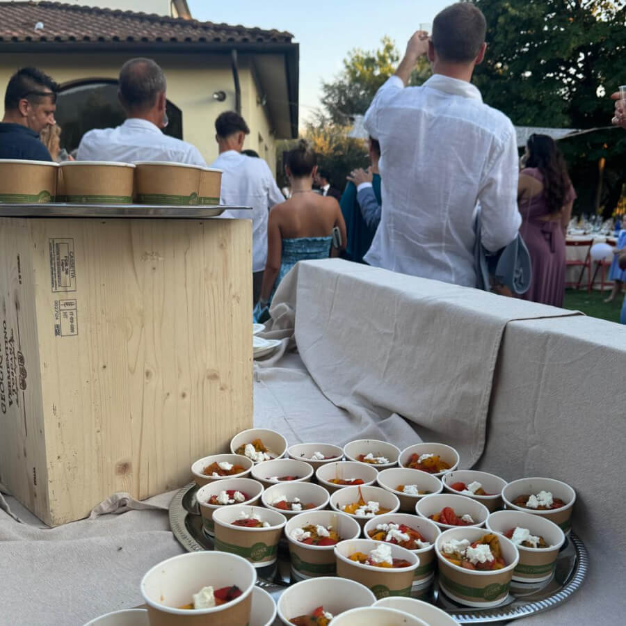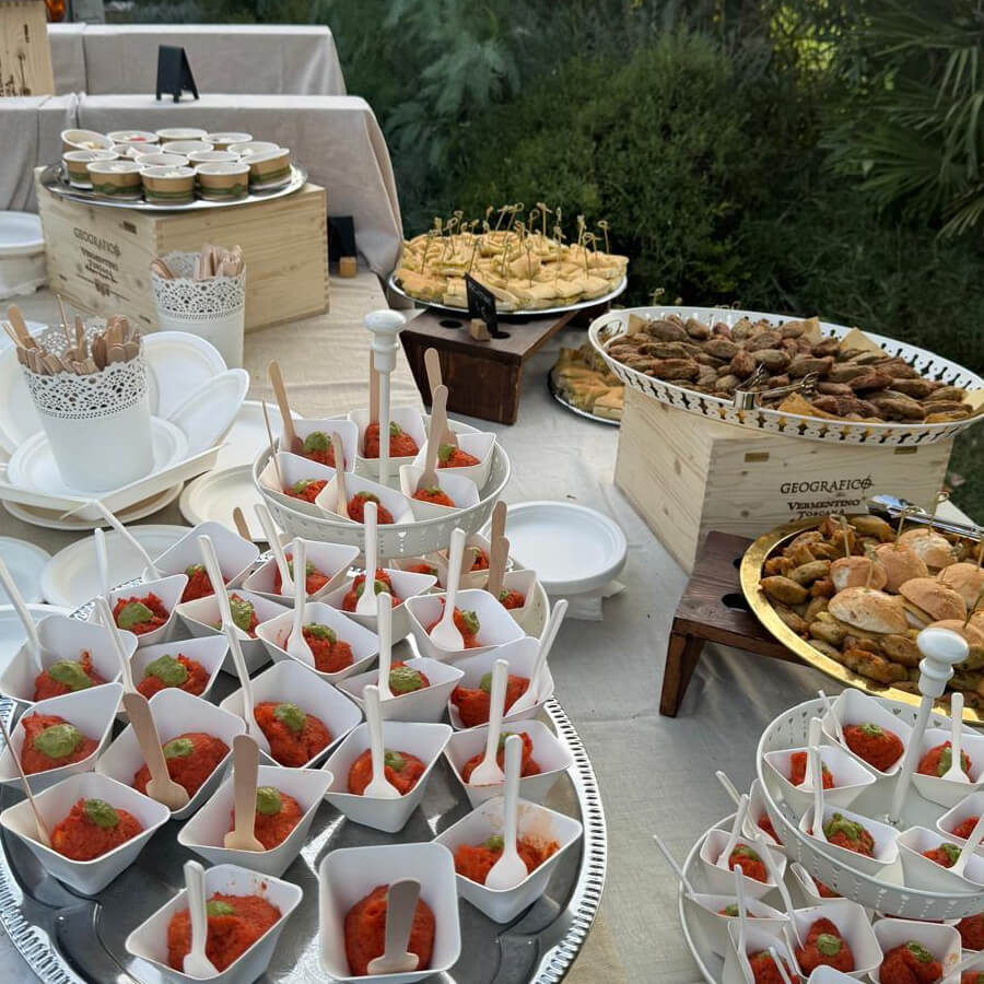 Gli sposi hanno espresso il desiderio di un catering interamente vegano per il loro matrimonio, abbiamo preparato un ricco e colorato buffet di finger food e due portate principali 100% vegan e 200% goloso.